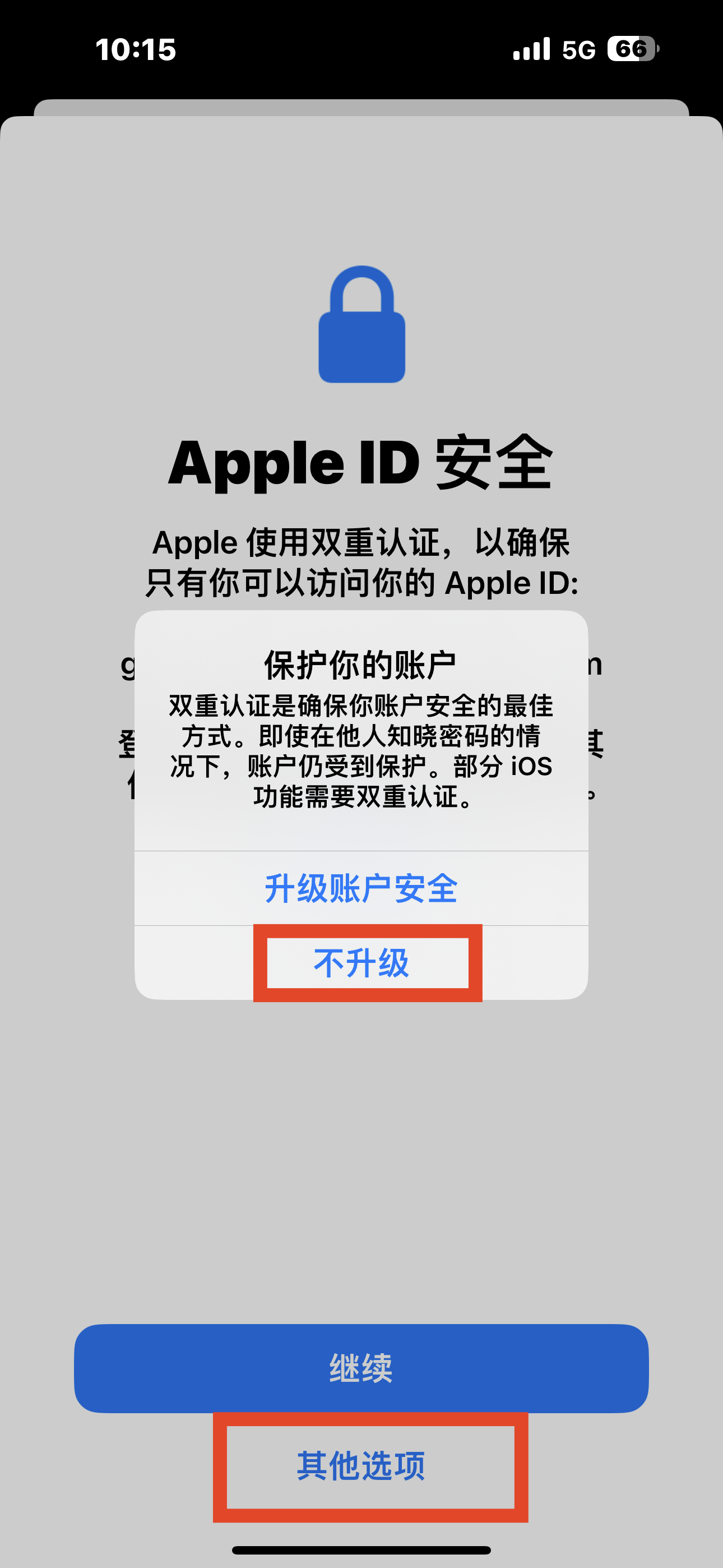 注意: 登陆时,系统弹出Apple ID安全提示,请依次选择“其他选项“——“不升级“,若您绑定了您的手机号导致您的账号财产损失,请自行负责!!